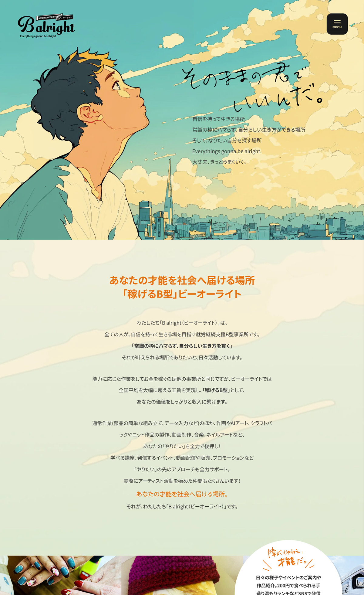 わたしたち「B alright(ビーオーライト)」は、全ての人が自信を持って生きる場所を目指す、就労継続支援B型事業所。全国平均を大幅に上回る工賃で「稼げるB型」として、あなたの価値をしっかりと収入に繋げます。音楽、アート、ネイルやクラフトなどあなたの「好き」を全力サポート!