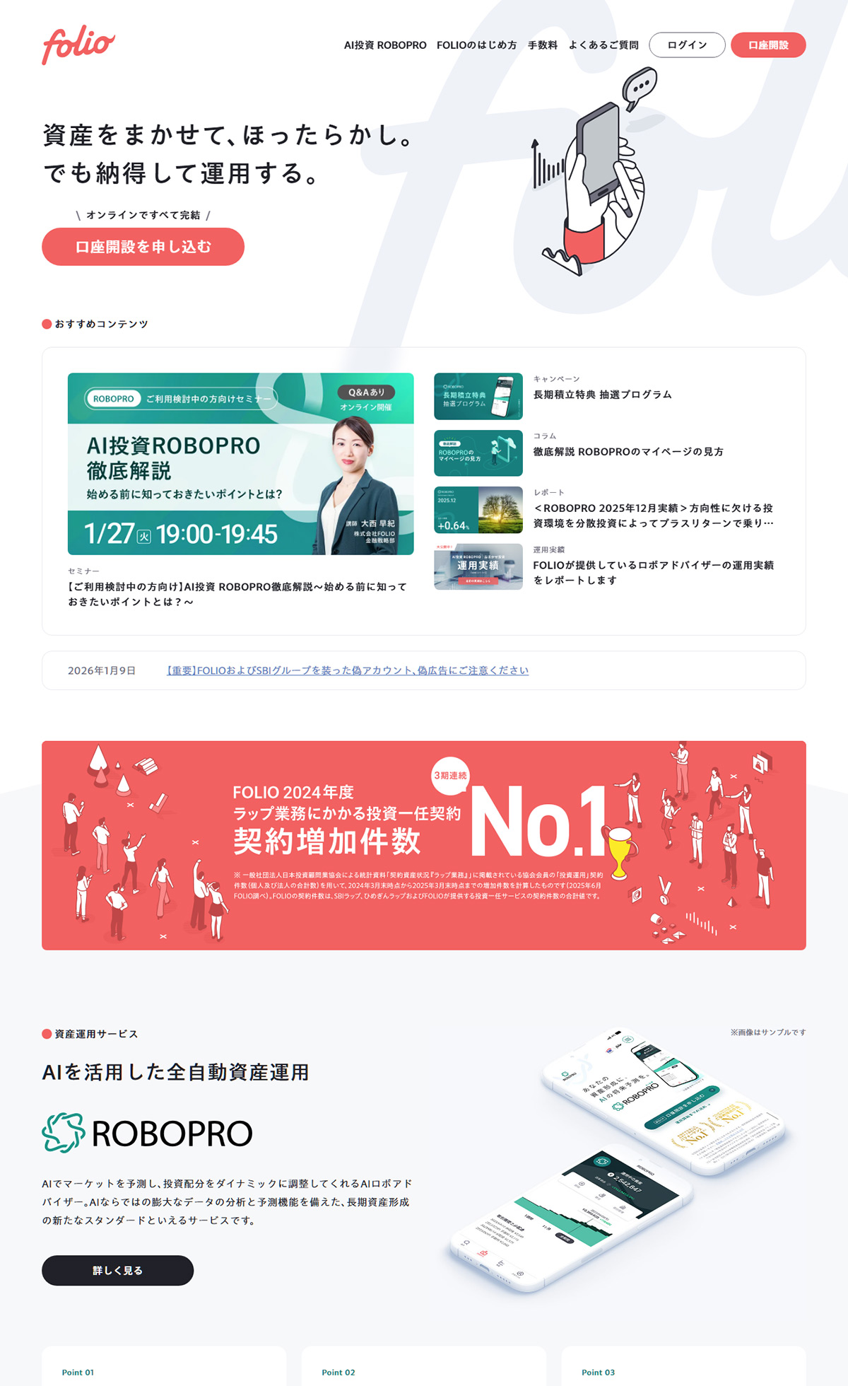 FOLIOは、AIの相場予測に基づいて大胆に資産配分を変更し、全自動で資産運用ができる「AI投資ROBOPRO」や、「おまかせ投資」というロボアドバイザーを提供する証券会社です。お客様の長期的な資産形成に役立つサービスをご提供します。