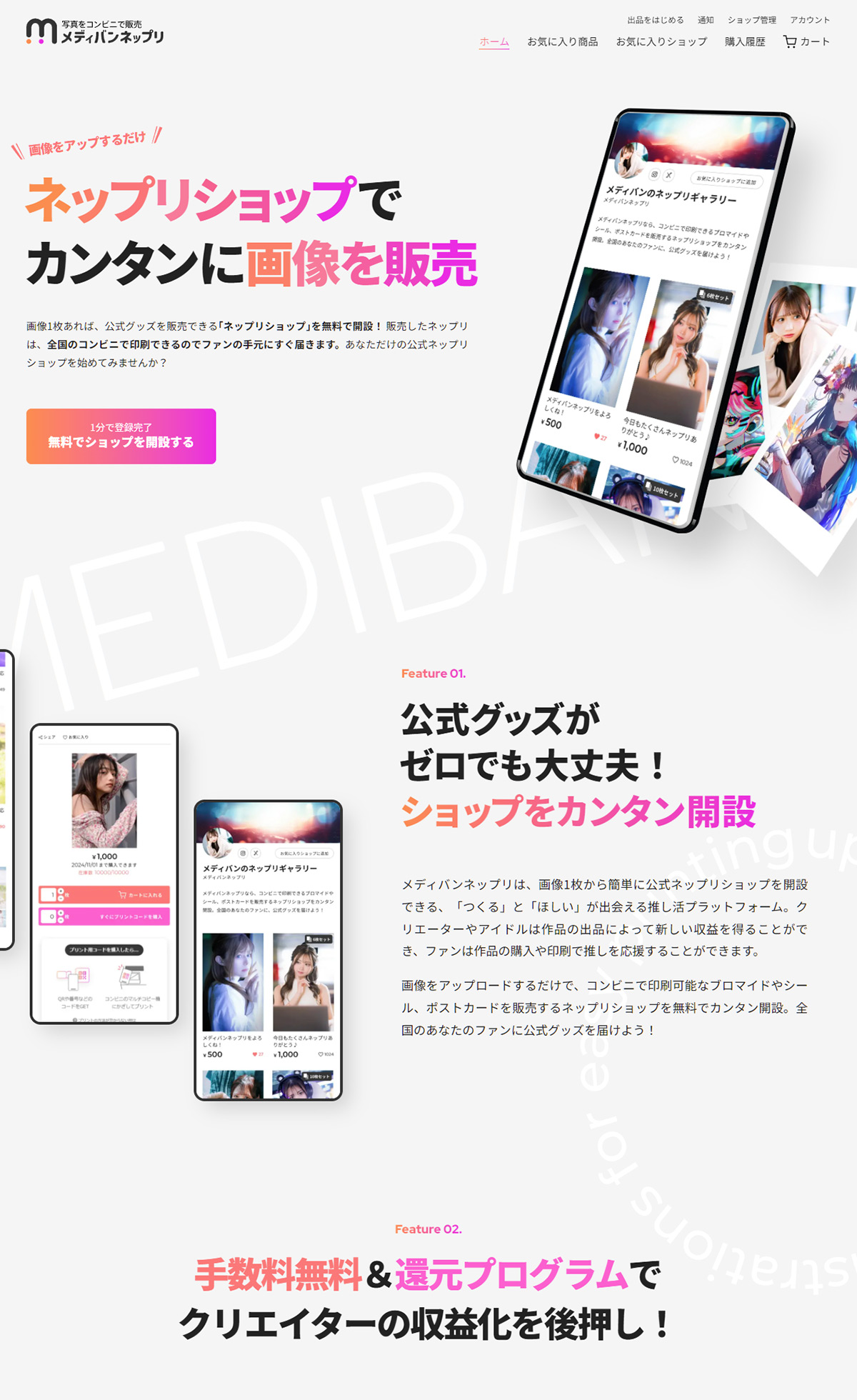 メディバンネップリは、写真を全国のコンビニで販売できるネットプリントサービスです。写真1枚あれば、あなたの「公式ネップリショップ」をカンタン無料で開設できます。