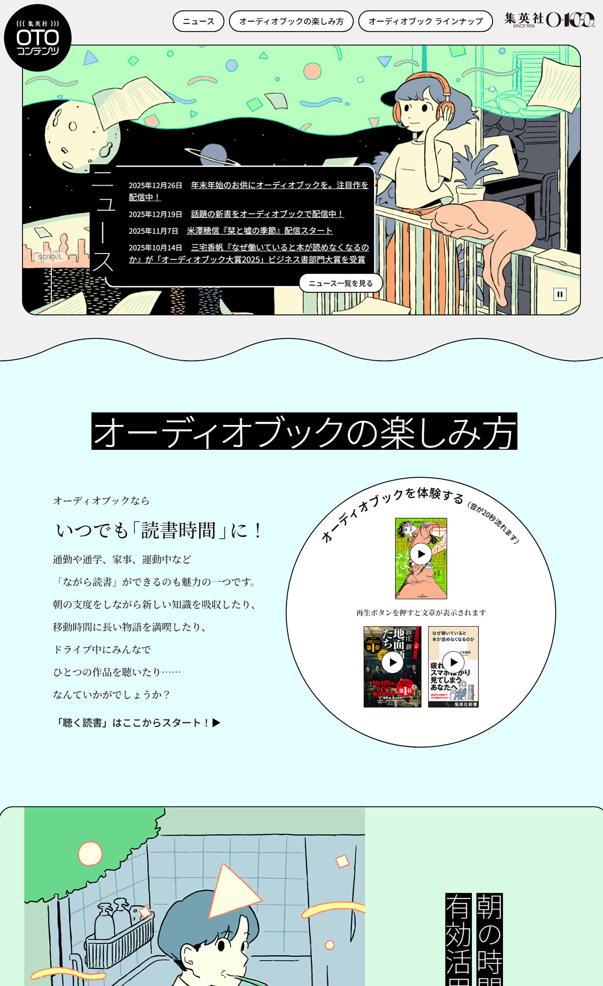 本サイト「集英社OTOコンテンツ」は、集英社のオーディオブック作品や音声コンテンツを紹介するWebサイトです。“KOTOBA(言葉)を紡いでOTO(音)と届ける”をコンセプトに、本を目で読むだけでなく、耳でも楽しむ読書をご提案します。