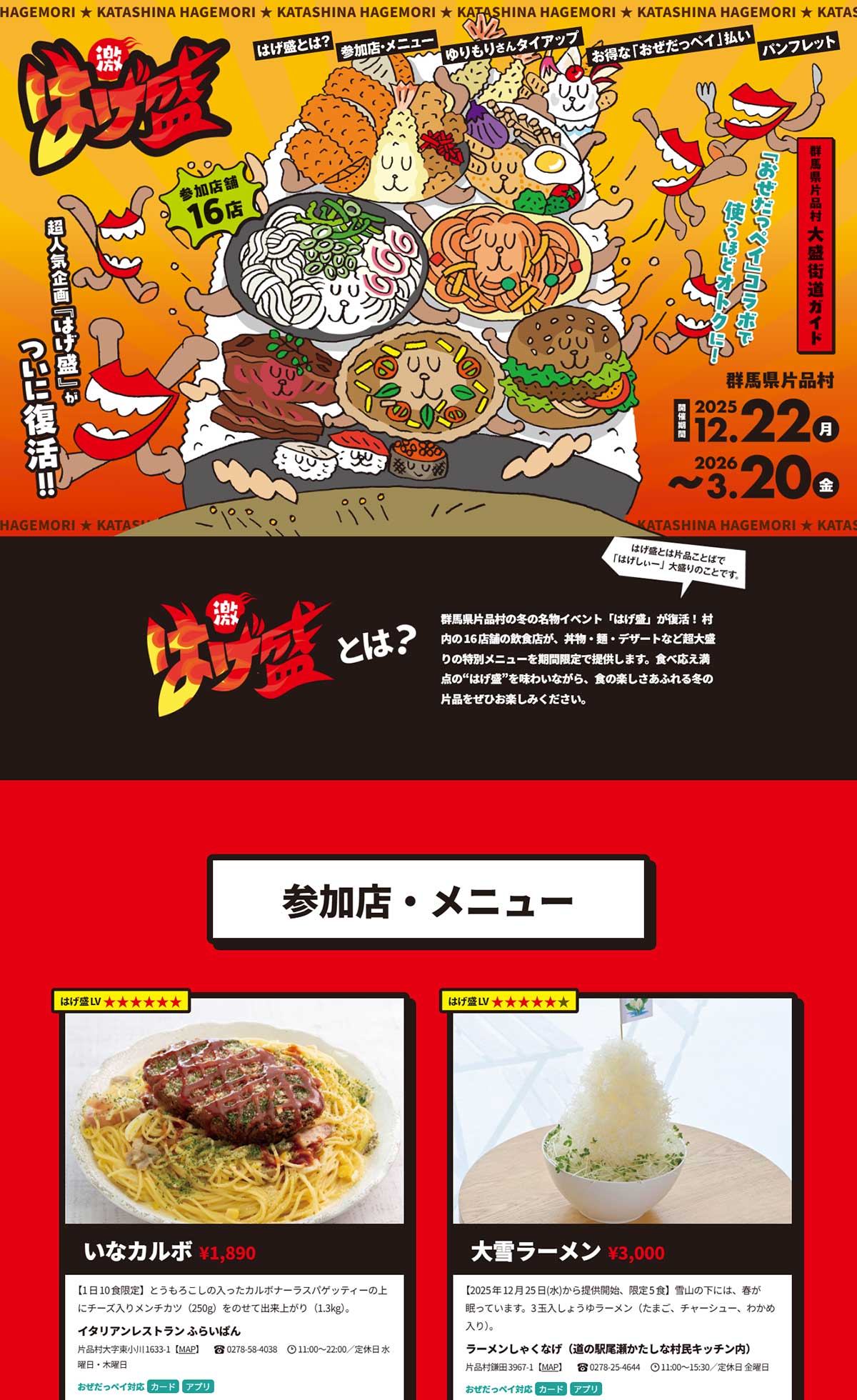 2025年12月22日〜2026年3月20日、群馬県片品村の冬の名物イベント「はげ盛」が復活! 村内の16店舗の飲食店が、丼物・麺・デザートなど超大盛りの特別メニューを期間限定で提供します。