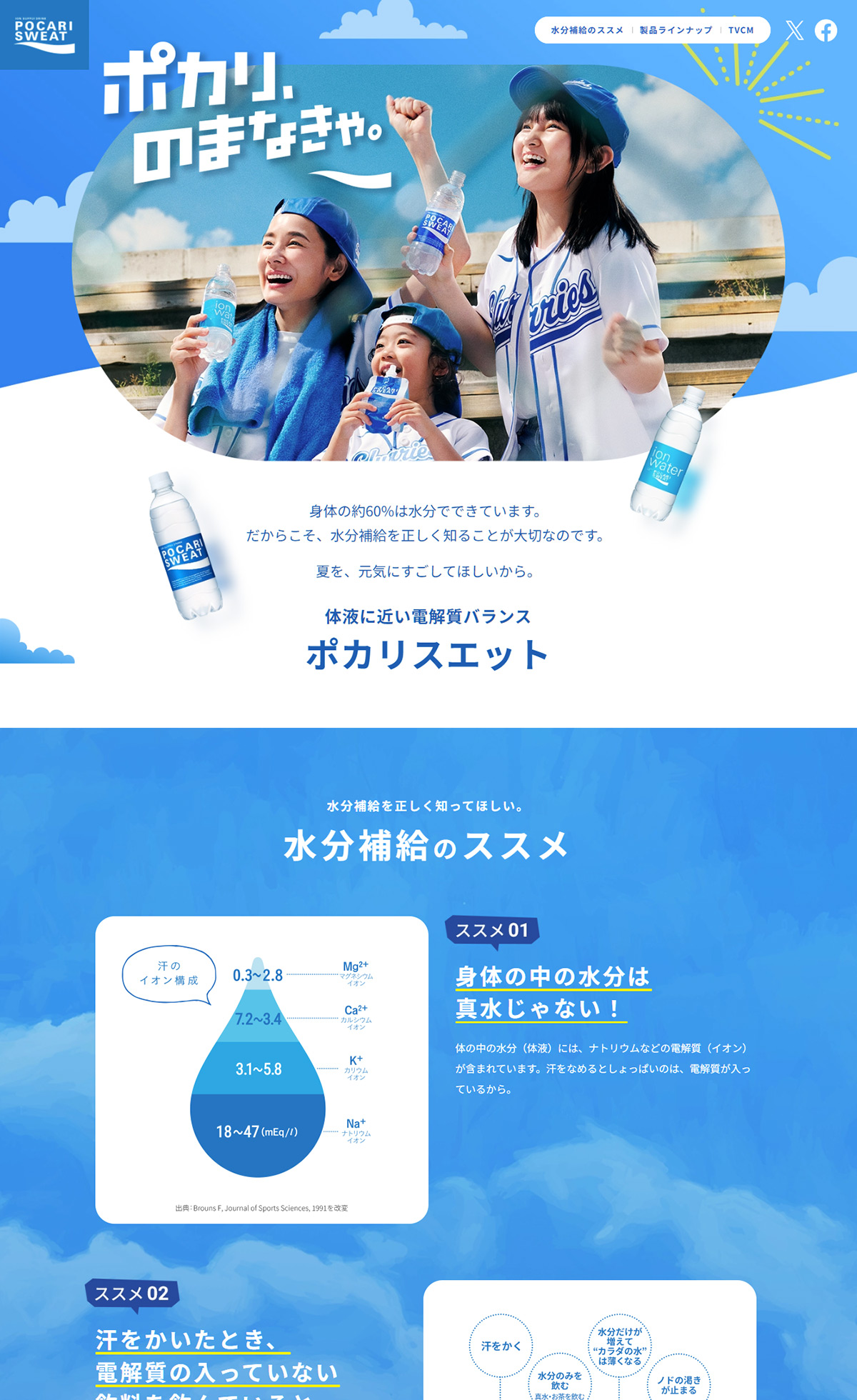 カラダの60%は水分でできています。だからこそ、水分補給を正しく知ることが大切。熱中症対策に夏の水分補給のススメ!夏を、元気にすごしてほしいから。体液に近い《 水分+電解質 》ポカリスエット!
