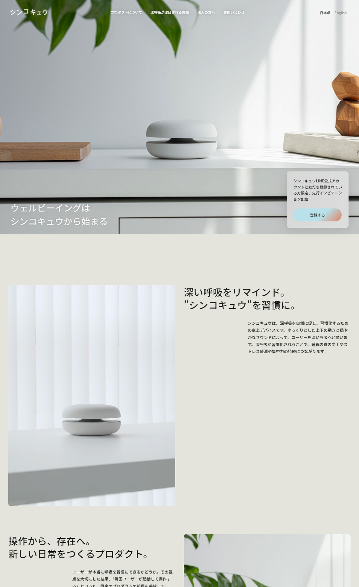 シンコキュウは、深呼吸を自然に促して習慣化するための卓上デバイスです。ゆっくりとした上下の動きと穏やかなサウンドによって、ユーザーを深い呼吸へと誘います。深呼吸が習慣化されることで、睡眠の質の向上やストレス軽減や集中力の持続につながります。
