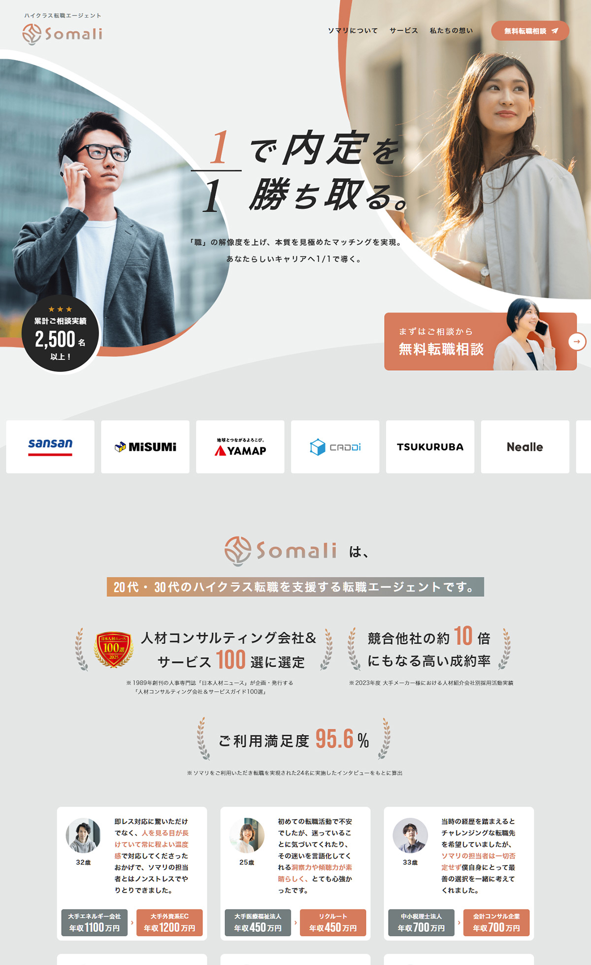 20代・30代を中心とした若手優秀層のハイクラス転職を支援する転職エージェントのソマリの「特設サイト」です。転職希望者お一人おひとりのご経験やご希望、嗜好性と照らし合わせ、1/1内定を実現するソマリの転職サービスの秘密を解説しています。